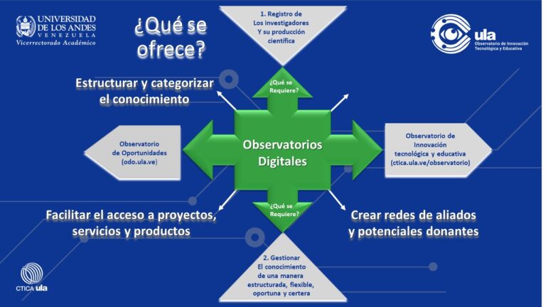 No obstante, la promoción, diseminación y monitoreo de las tendencias de innovación tecnológica y educativa, son poco divulgadas y visibles en la Web, son aspectos claves para el Observatorio de Innovación Tecnológica y Educativa que se gestiona desde el Consejo de Tecnologías de la Información y Comunicación Académica (CTICA), dependencia adscrita al Vicerrectorado Académico de la ULA; representando una plataforma que permite potenciar lo que sucede en la universidad y en el mundo científico.